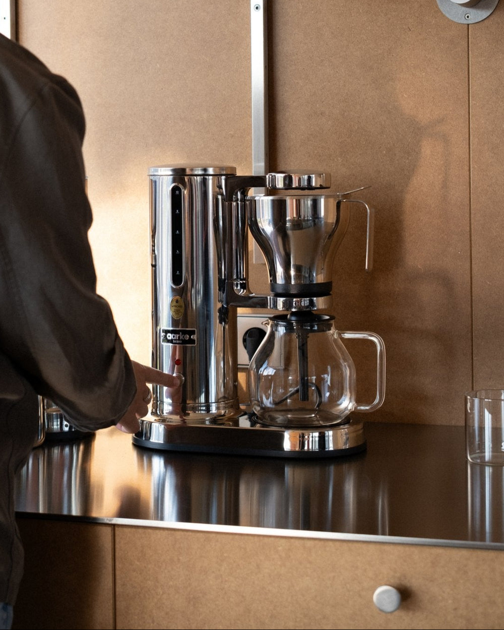 Automatic dosing with the integrated Aarke Coffee System. For optimal consistency: connect the grinder to the coffee maker, and it will automatically calculate the beans-to-water ratio.